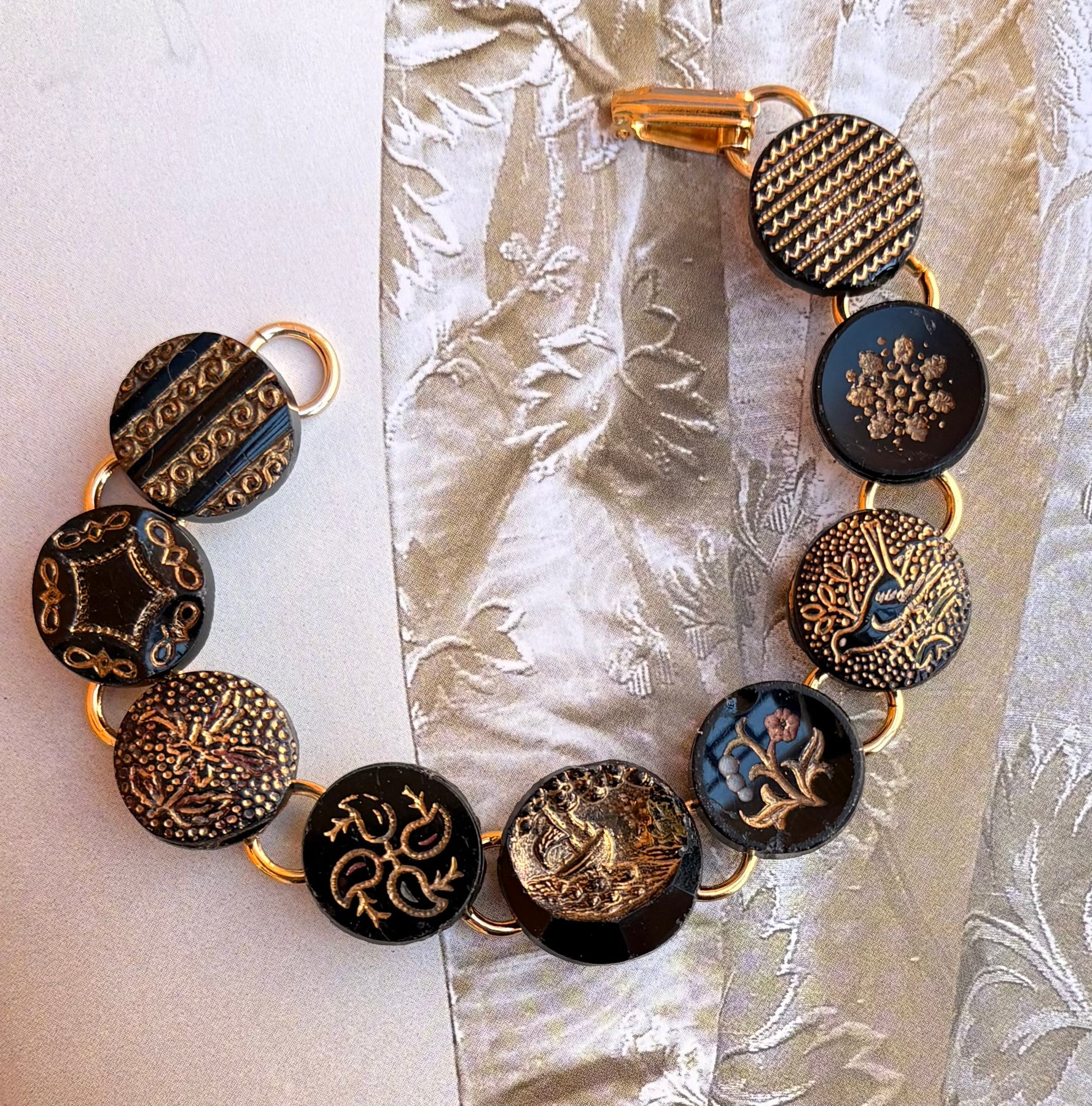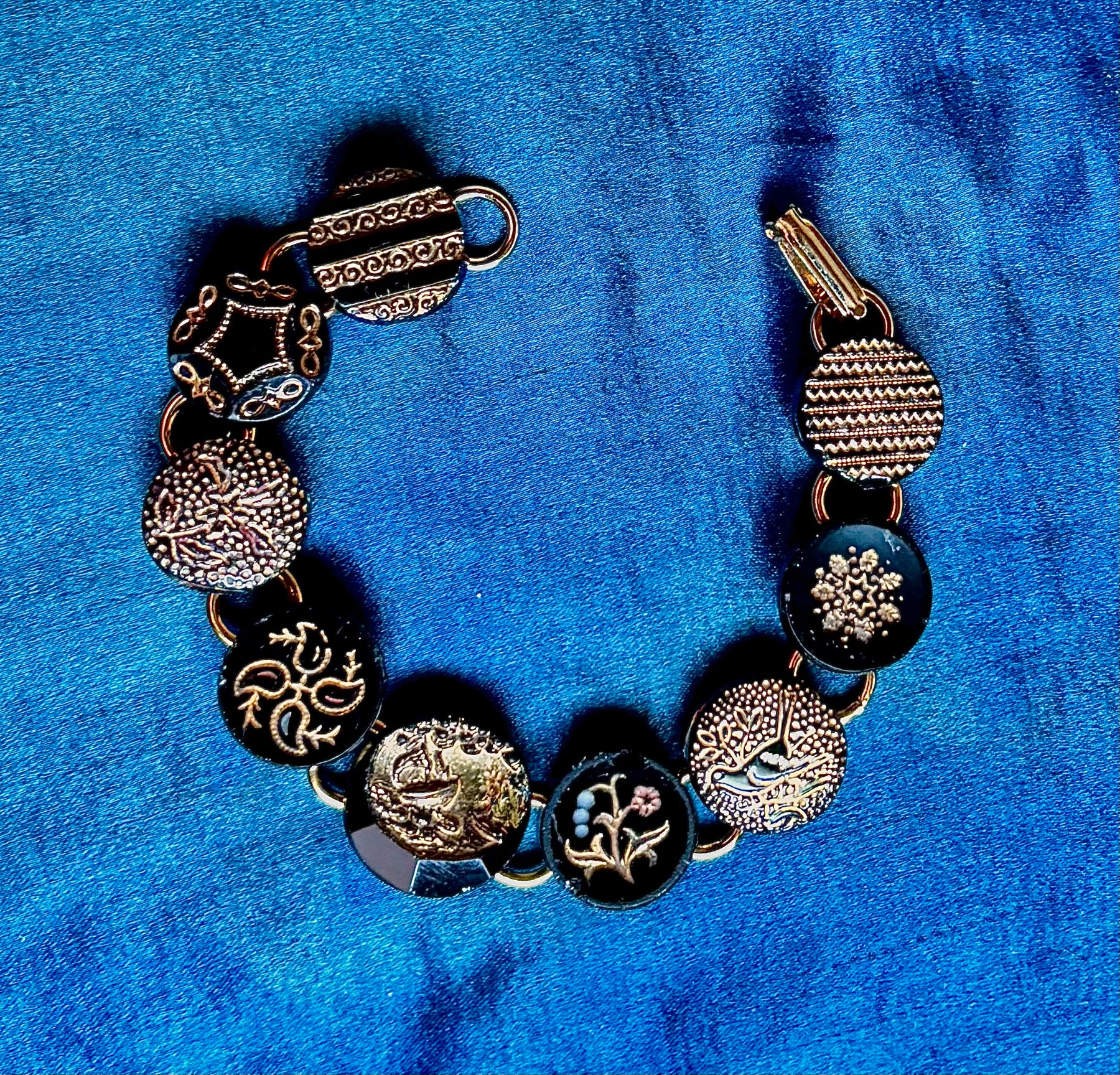 Black glass buttons gained popularity in 1860’s when Queen Victoria used jet buttons on her mourning clothing. Most glass buttons are sometimes called jet, but these glass buttons were more accessible to the masses than actual jet gemstones. The black glass buttons with luster finishes (gold or silver) became in favor again from post 1920’s until the late 1940’s when Czech glass buttons were produced in abundance. The designs are varied but always beautiful. These bracelets can be worn dressy or for everyday… but always enchanting!