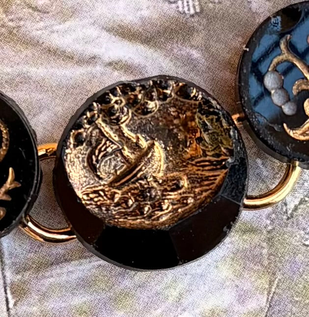 Black glass buttons gained popularity in 1860’s when Queen Victoria used jet buttons on her mourning clothing. Most glass buttons are sometimes called jet, but glass buttons were more accessible to the masses. These black glass buttons have lovely varied designs from gold detailing & carvings. They have some chips & scratches due to their use and age (1870’s - 1914)… but charming nonetheless!