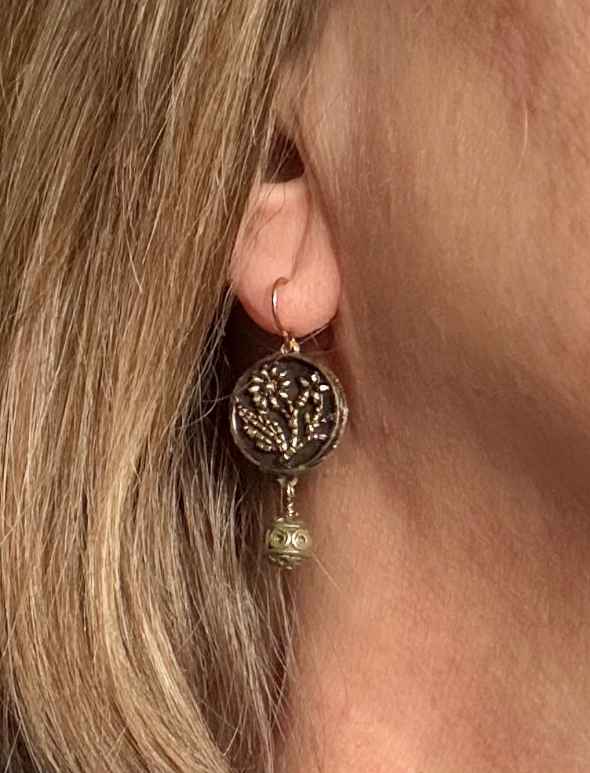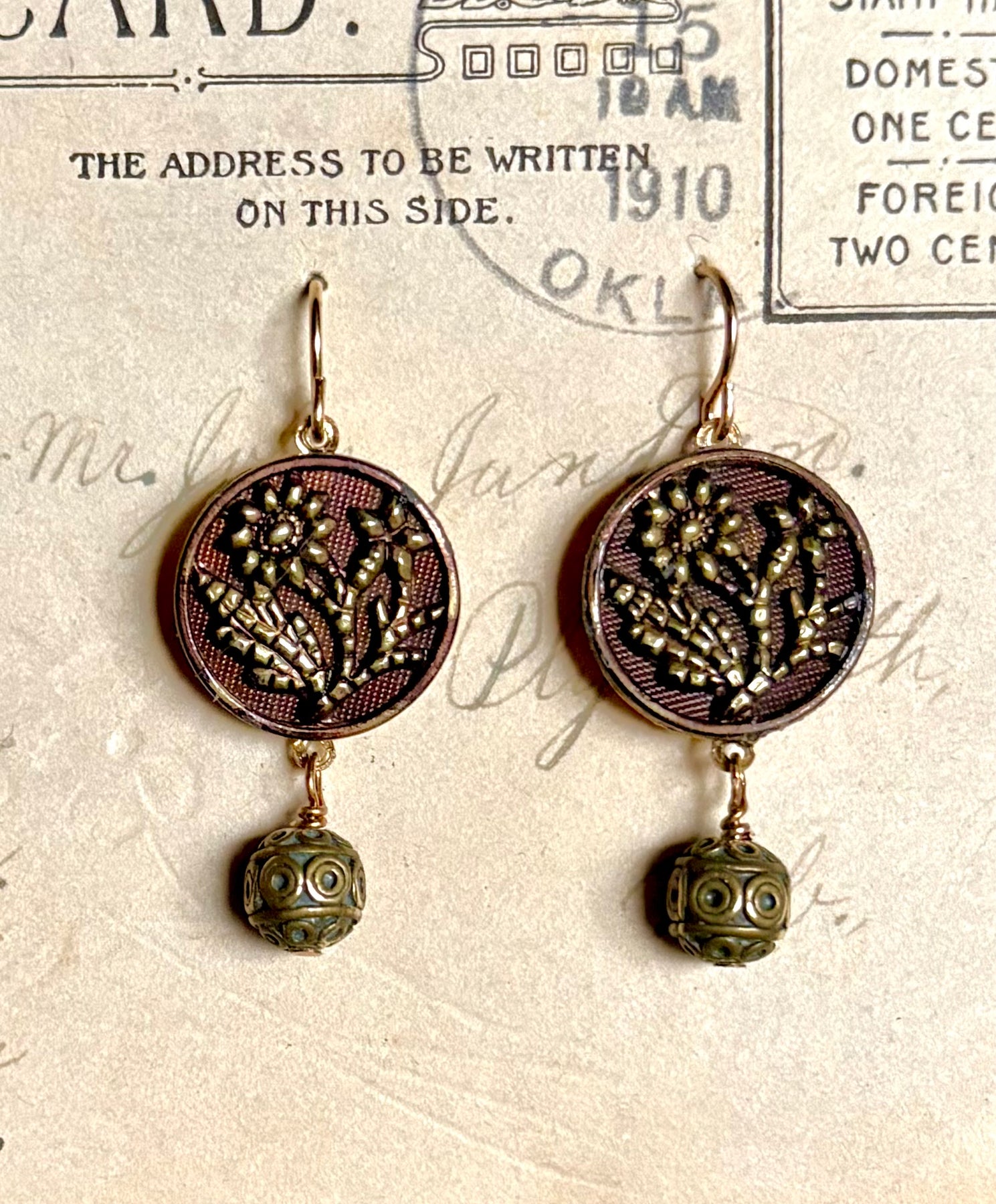 The combination of gold and silver is so interesting and elegant. I used these 1800’s stylized flora buttons & added mixed tone baubles for the drops. History will look so beautiful on you!