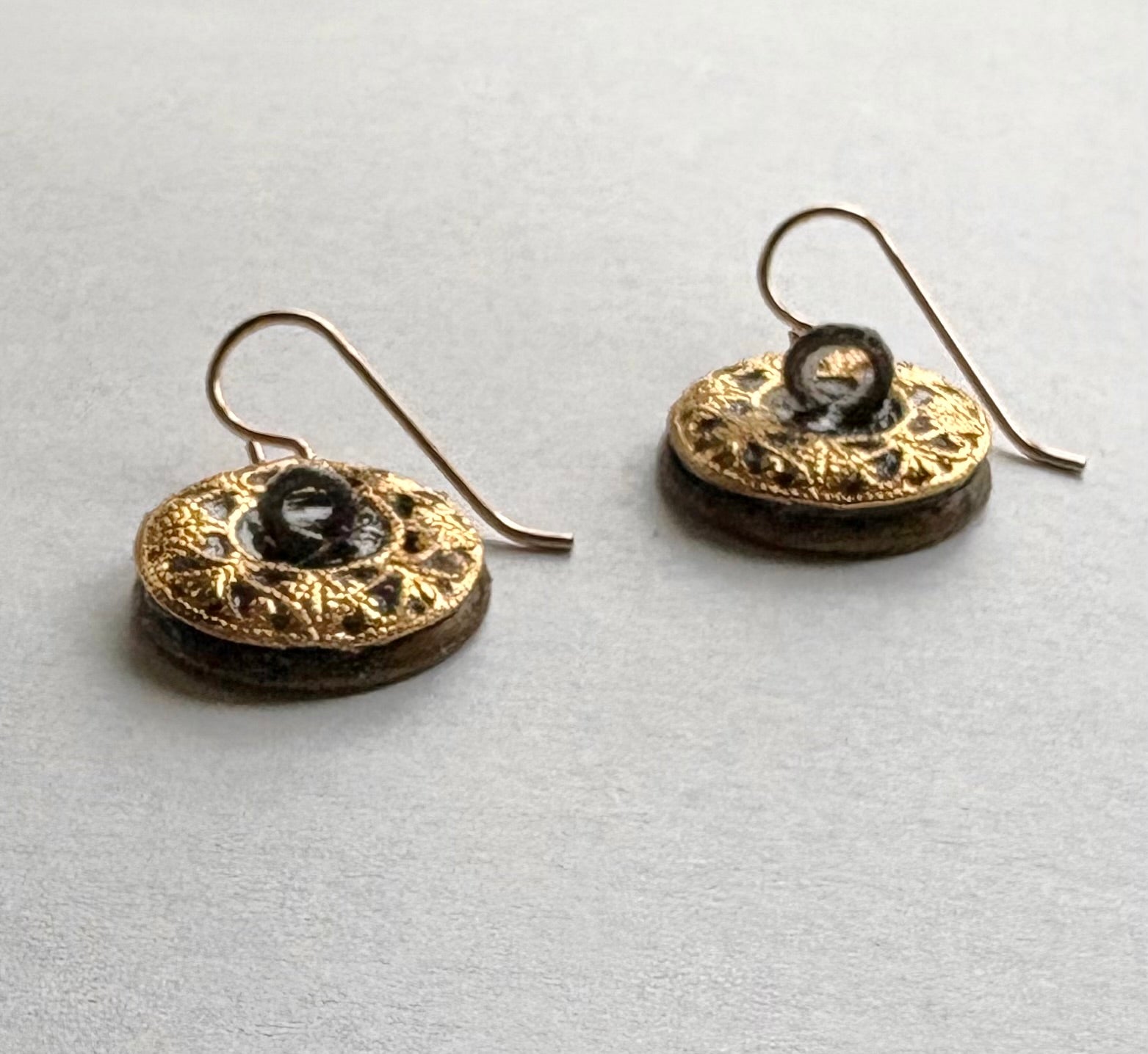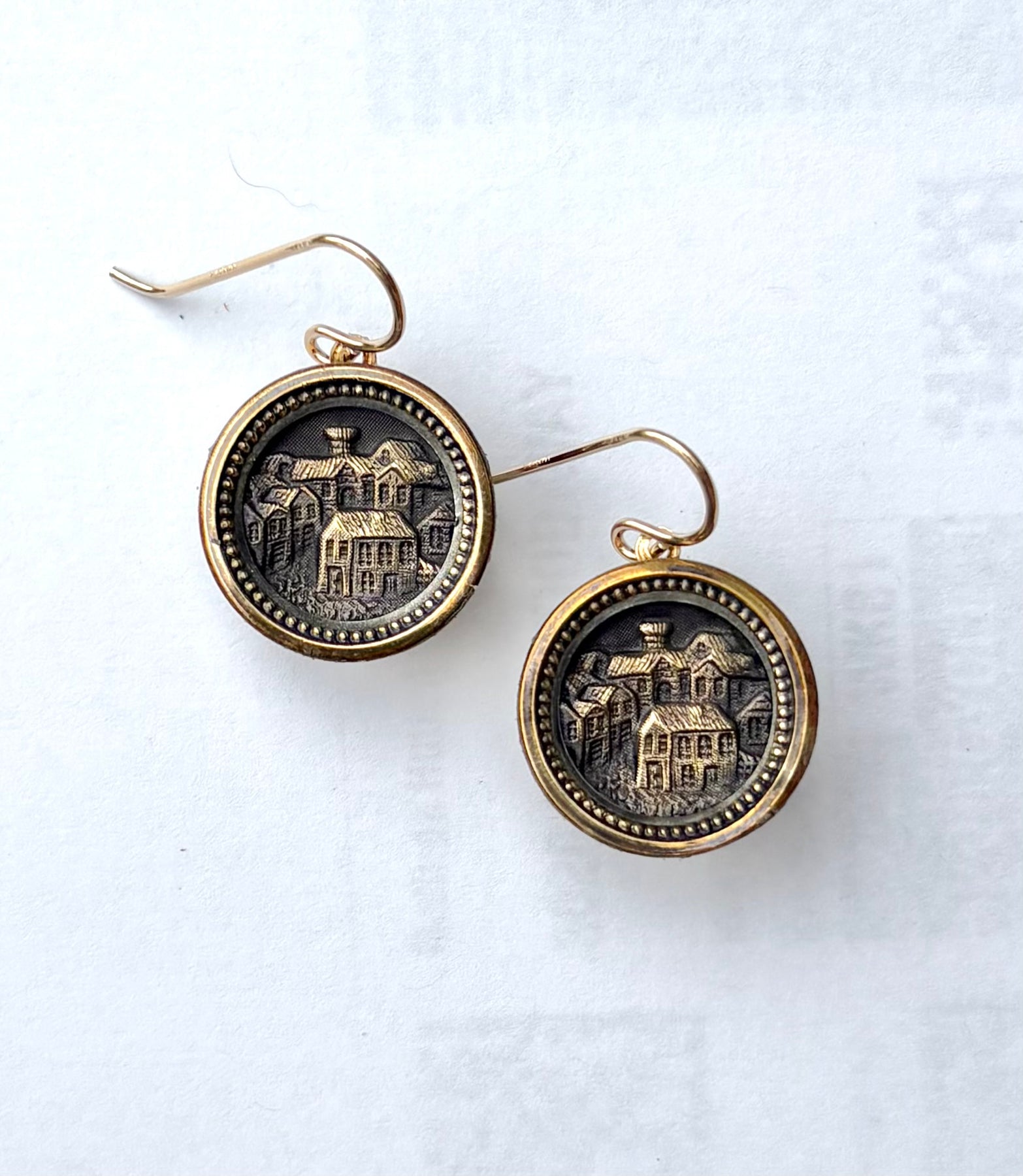 These Late 1800’s picture buttons feature a town with buildings. I have set these with the shank left on to preserve their collectibility. Wonderful statement earrings you will love!