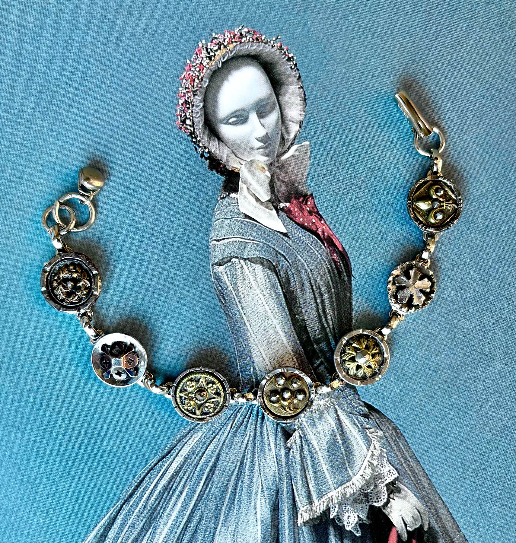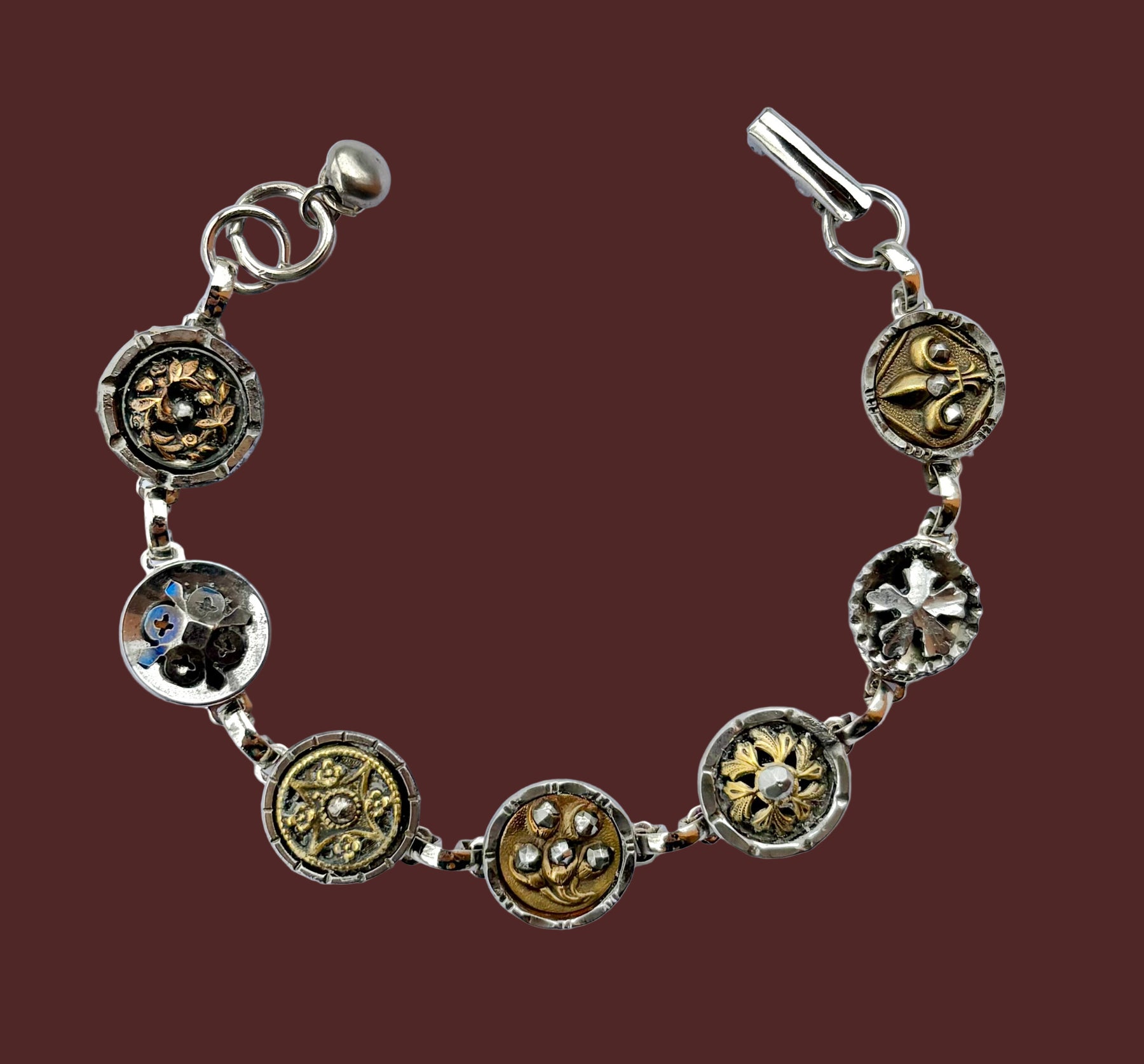 These steel buttons were made from late 1700’s thru early 1800’s by riveting small steel pieces onto a brass backing. Originally they were thought of as a substitute for diamonds and marcasite. They must have sparkled in the candlelight of an evening gathering! I don’t make them in volume due to the difficulty of working with multiple tiny pieces that make up each button. When I have the temperament for the detail work I love designing with them. The gold and silver contrast is very striking & you will treasure this piece!