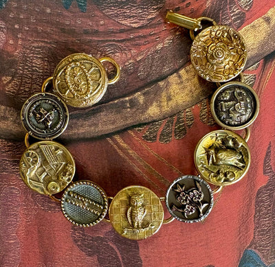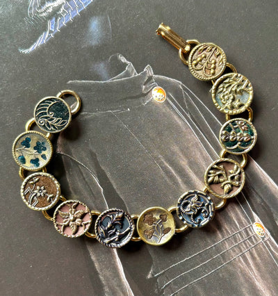 It is amazing how many comments you will receive when you are wearing an antique button bracelet! The history, age & beauty of these buttons is fascinating. This piece includes florals, mirror backs and some great geometrics. A piece you will treasure!