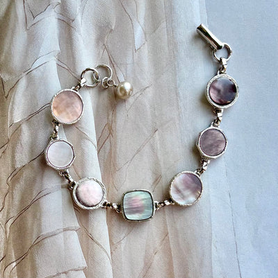 Imagine the dapper man that never left his home without his stylish cuff links. These exquisite pieces are reimagined into a one of a kind bracelet that is sure to cause a stir! The bracelet features seven antique cufflinks in a shaded pearl that will pick up whatever color you are wearing! This will be your “go to” bracelet.