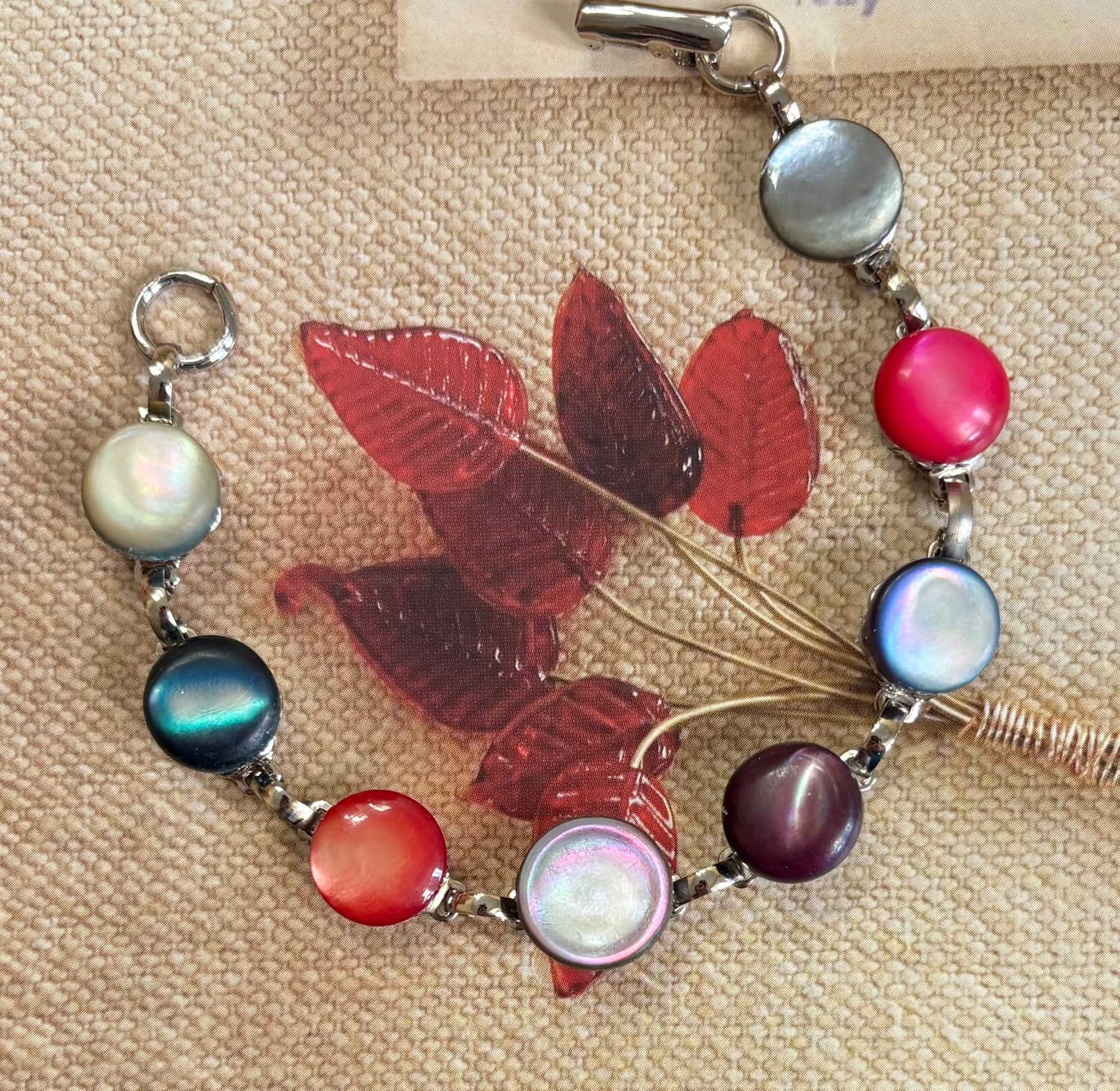 You have probably seen these innocuous shaded pearl buttons in your Mom’s or Grandma’s button stash. True story, I made a similar bracelet from these buttons 15 or so years ago. Many shows passed and this piece received very little attention. So, I pulled it out of inventory & started wearing it. (Everyone always loves my sleeper pieces after I claim them for my own.) I have found this piece one I wear ALL THE TIME! It is a great size & proportion to layer with my other button bracelets! AND… it is a great piece on its’ own when I need a little something for casual wear. Of course no two bracelets are alike, but this one is in the same style as mine… and I know you will love yours as much as I love mine!