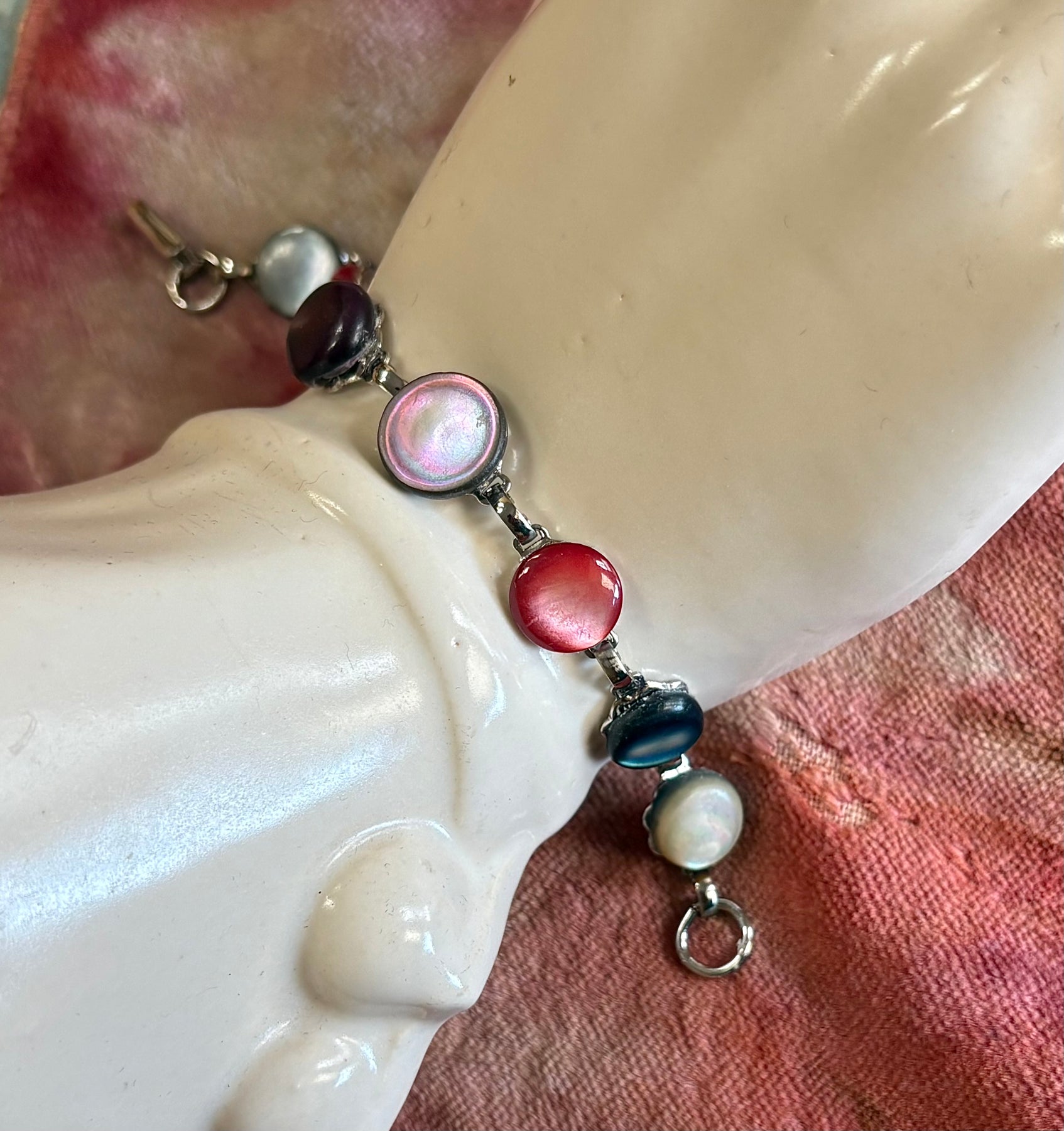 Subtle color differences between these late 1800’s buttons add so much interest to this bracelet! Vivid blue tints are spread out between burgundy & brown tinted buttons. There are florals & geometric designs as well as a mirrorback center button. You will love the details on this bracelet!