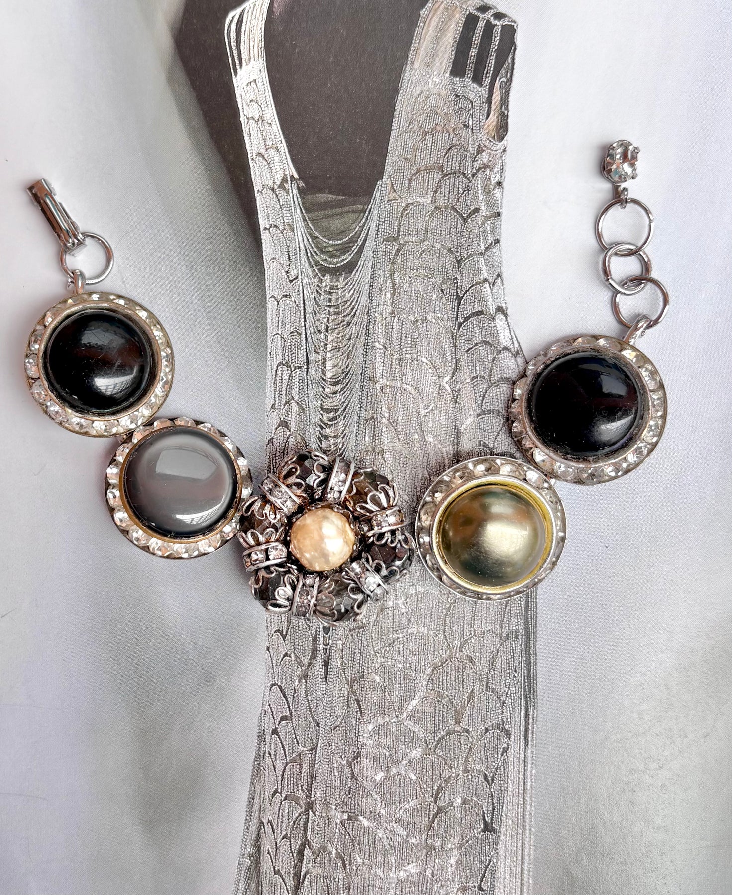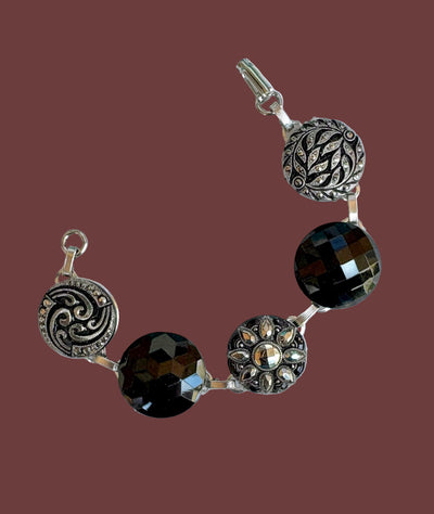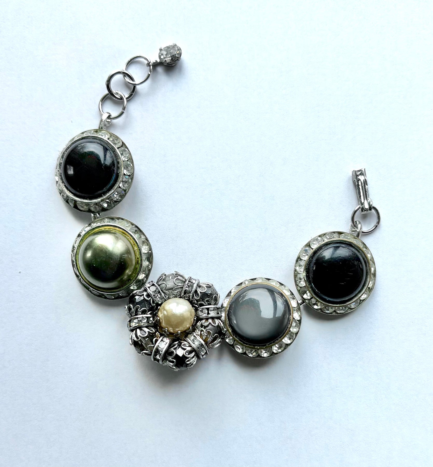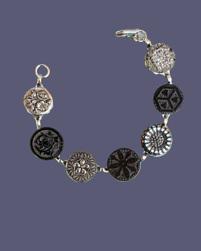 Black glass buttons gained popularity in 1860’s when Queen Victoria used jet buttons on her mourning clothing. Most glass buttons are sometimes called jet, but these glass buttons were more accessible to the masses than actual jet gemstones. The black glass buttons with luster finishes (gold or silver) became in favor again from post 1920’s until the late 1940’s when Czech glass buttons were produced in abundance. The designs are varied but always beautiful. These bracelets can be worn dressy or for everyday… but always enchanting!