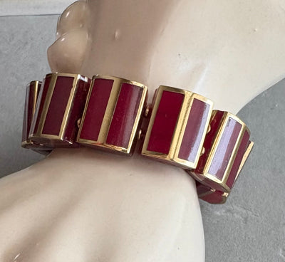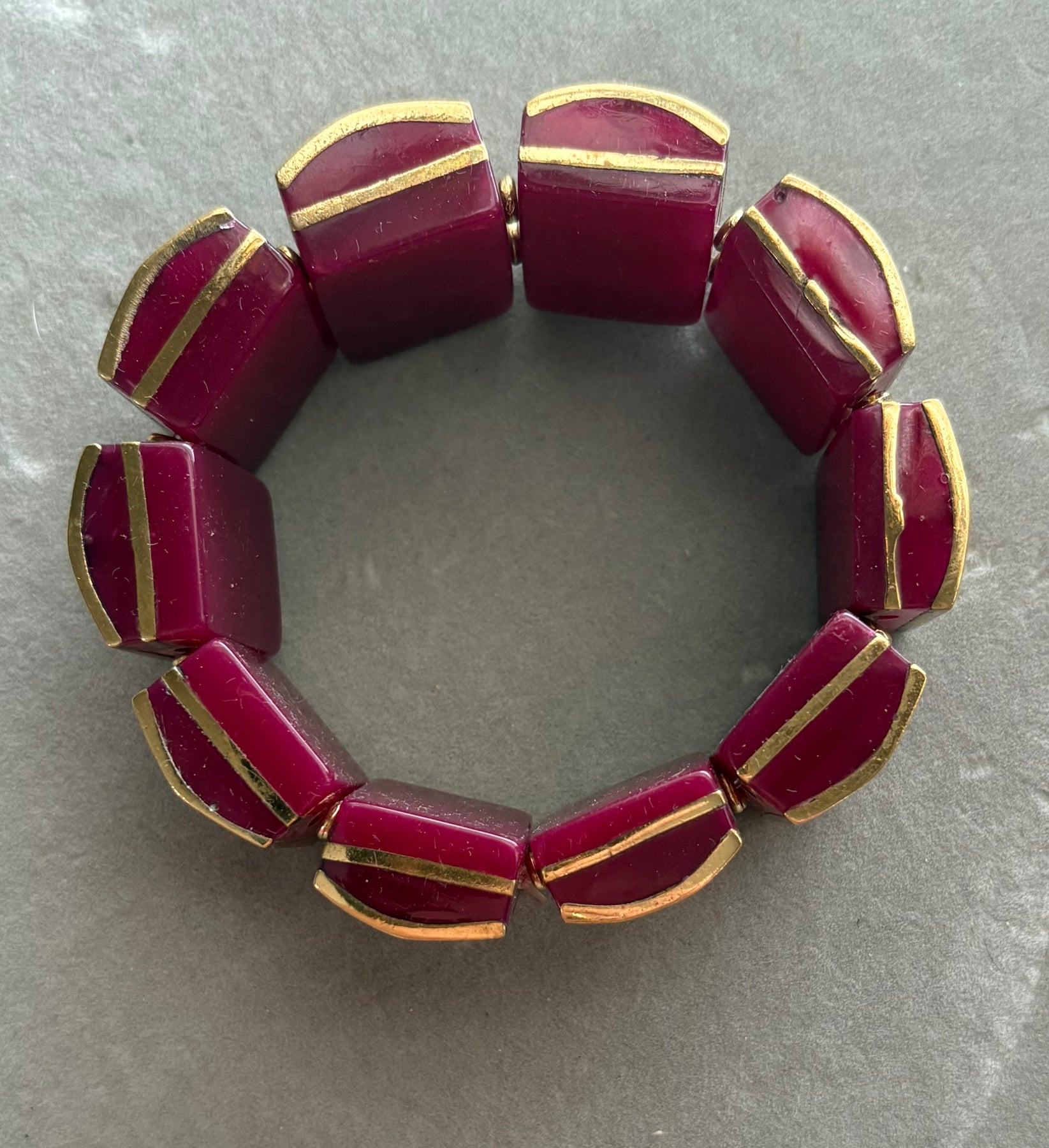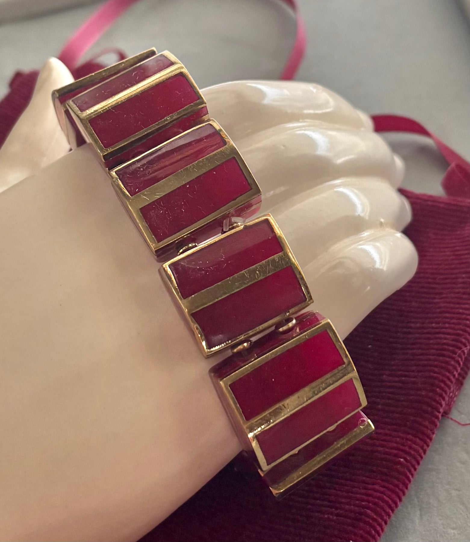 This vintage bracelet is in good used condition. The stones have great sparkle that flash from deep pink to orange. They are set between gold tone framing. A great piece to layer or wear on its’ own!