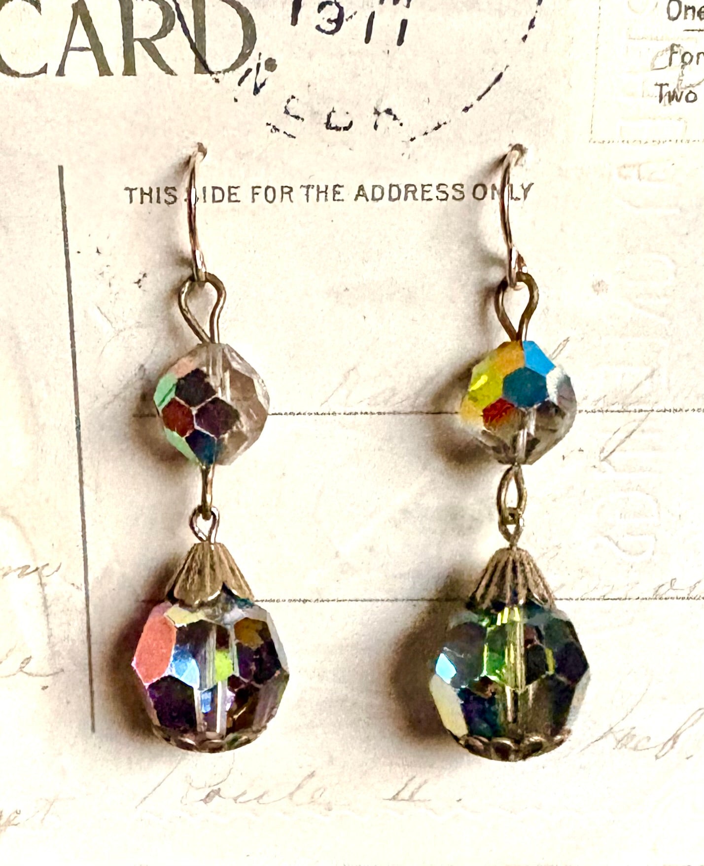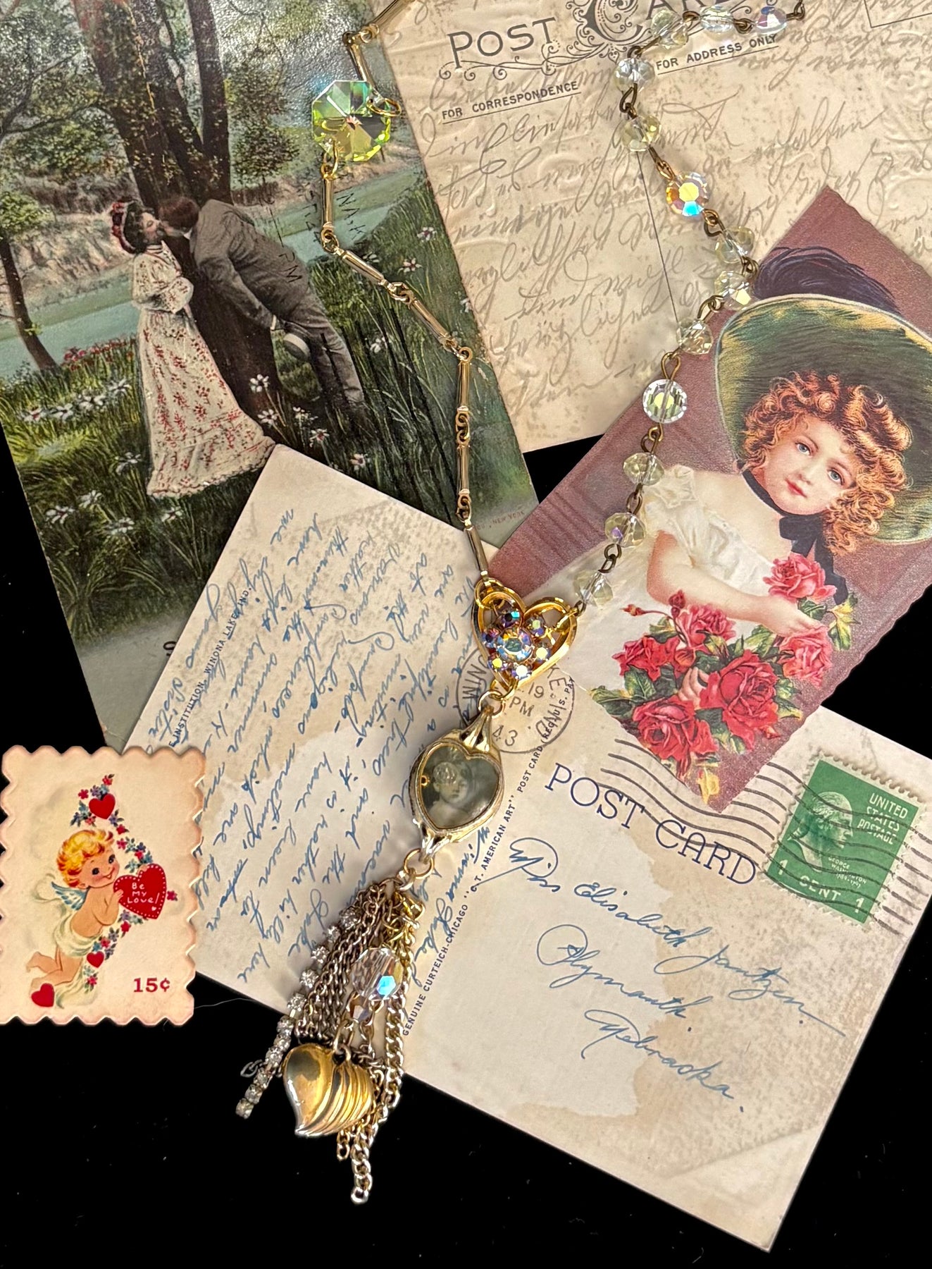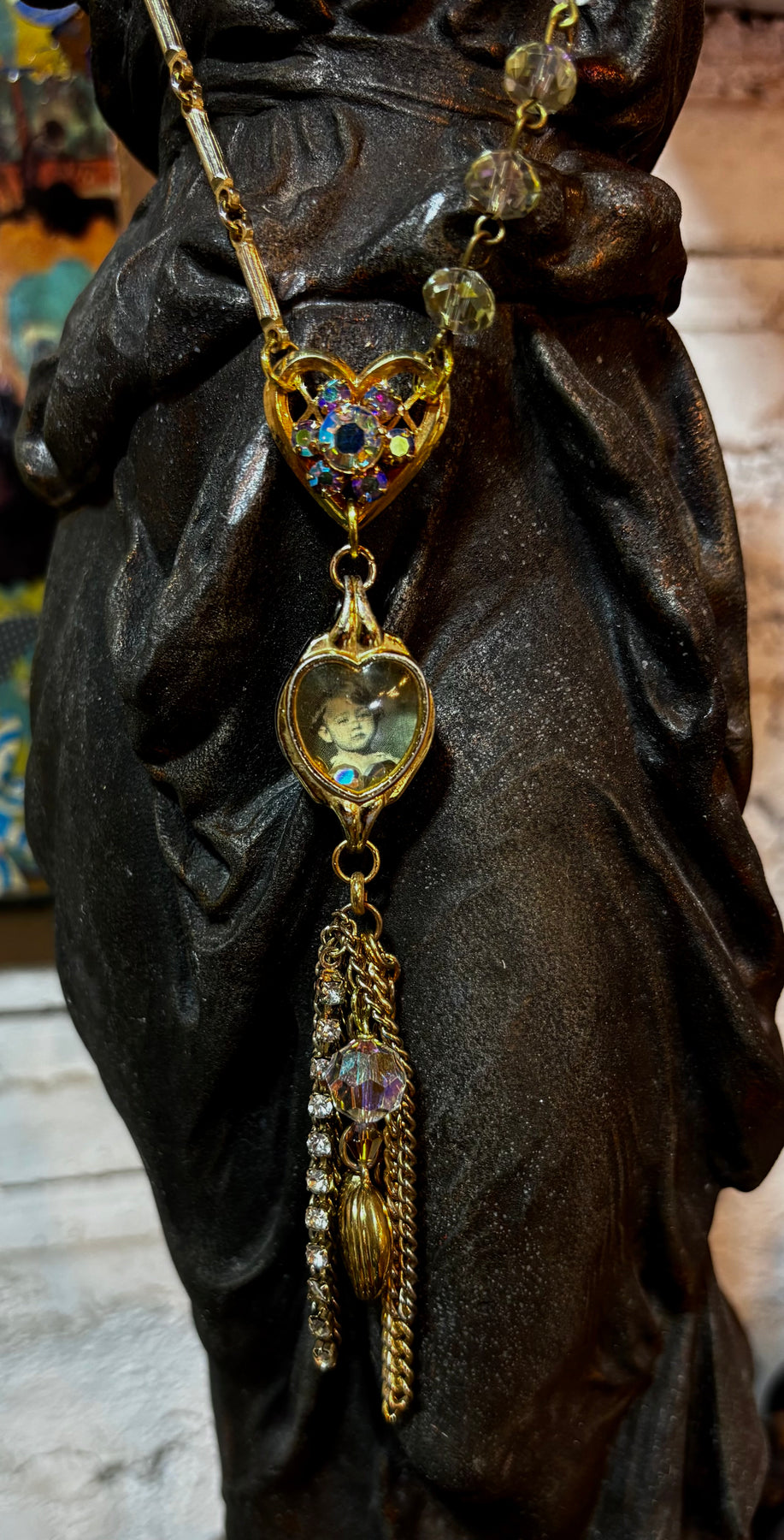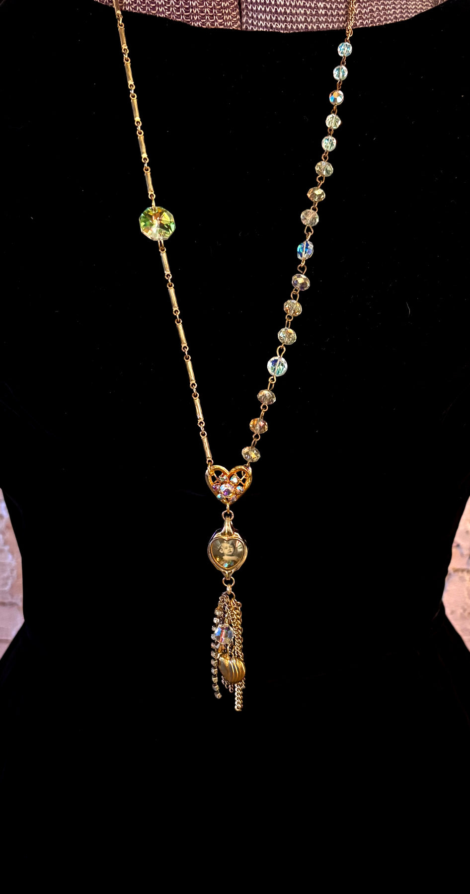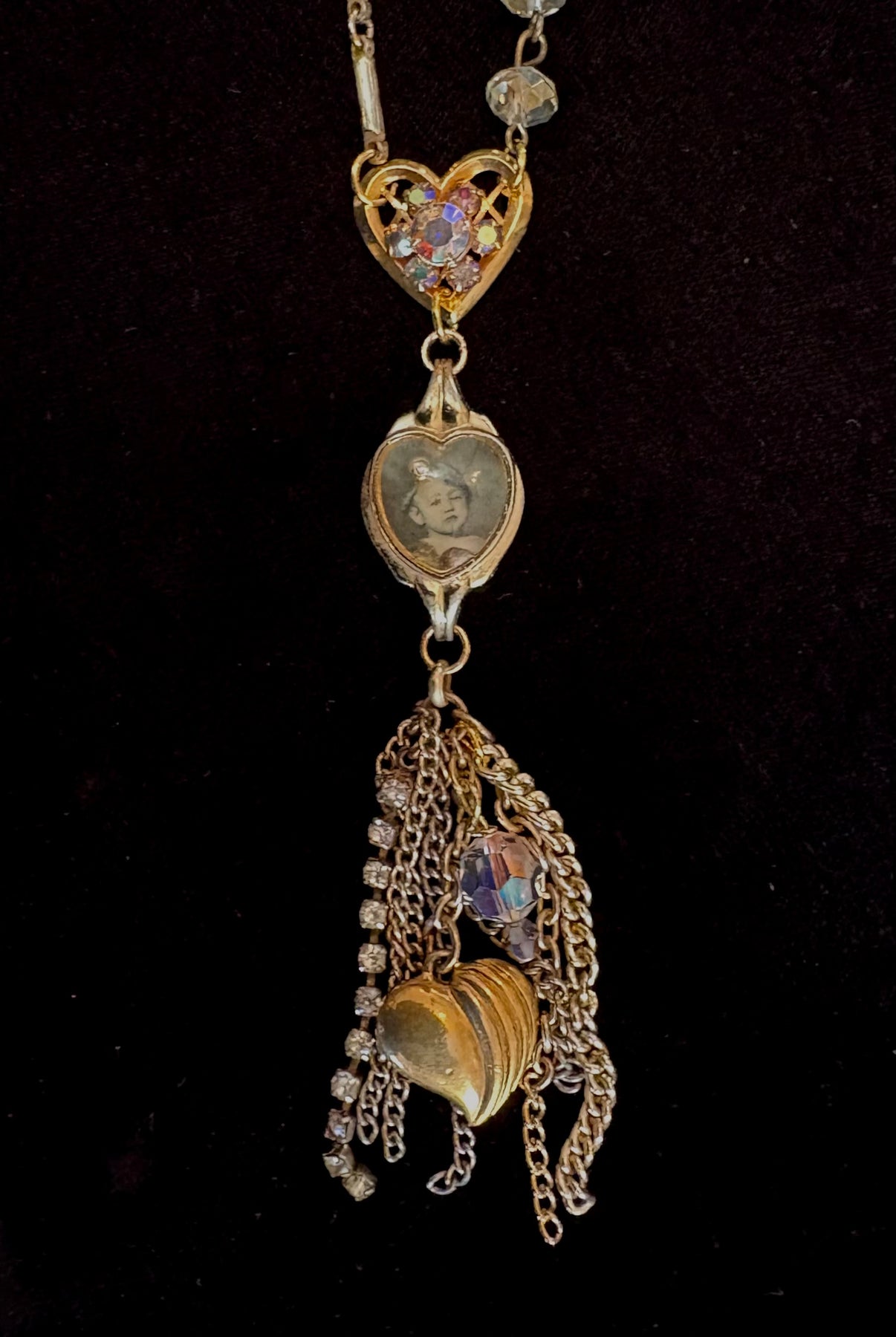 I was so excited to source this scarce vintage wristwatch case in the shape of a heart! I combined a mix of chain, aurora crystals & remnants of costume jewelry to add to this sweet statement necklace. There is a vintage image of a boy inside the case along with 3 beads that freely move under the case. If you are a bit crafty, open up the case and put your own picture inside. (I did not glue down the image so it can be easily removed.) A sweet sentimental piece you will LOVE!