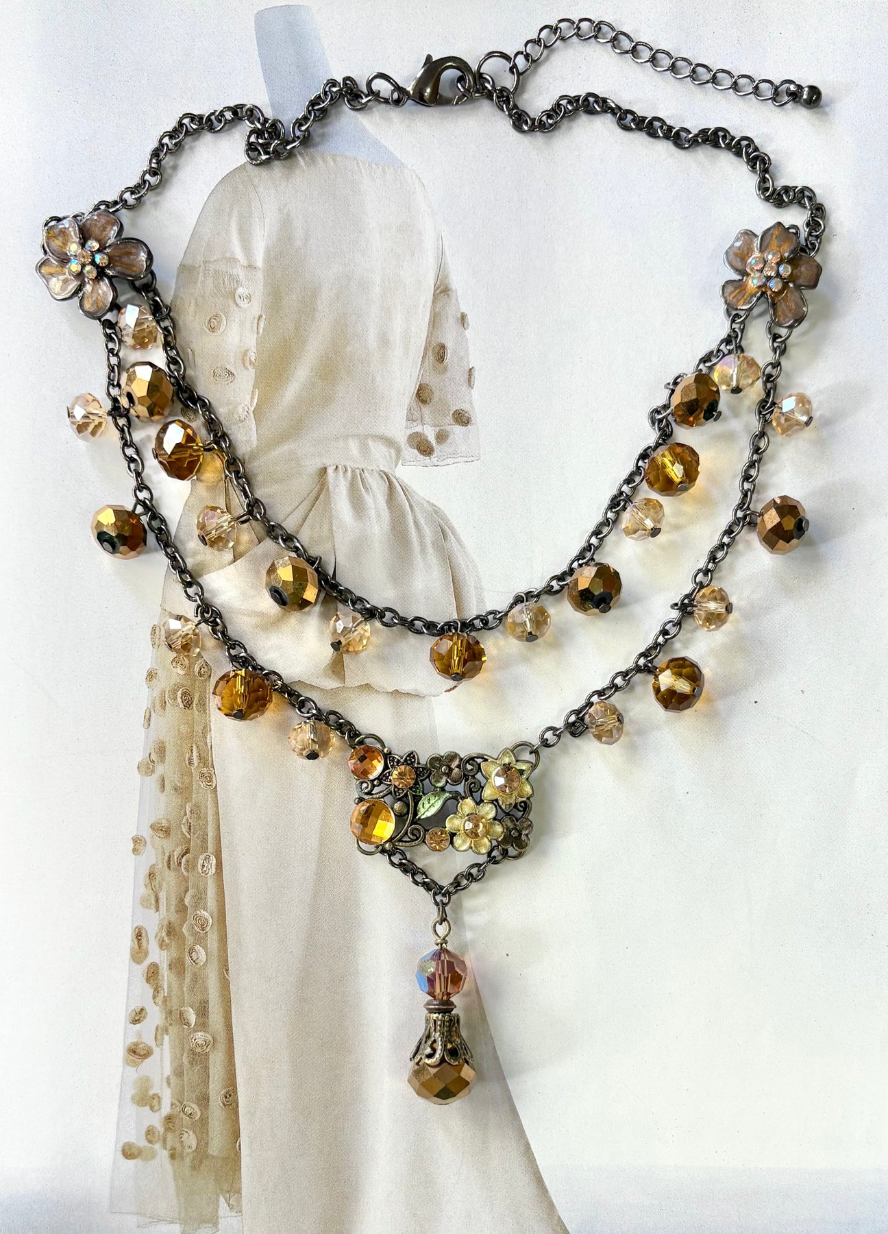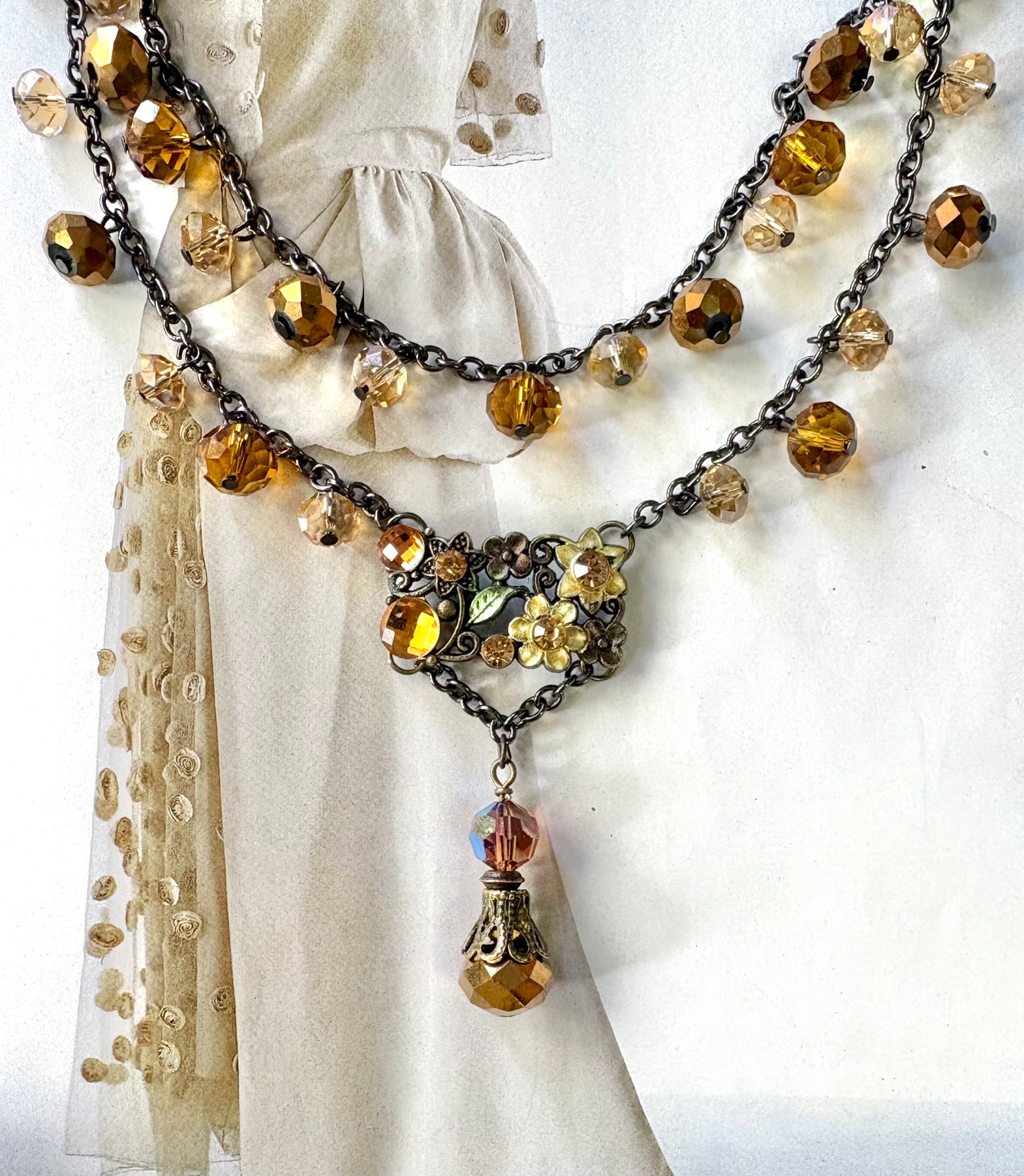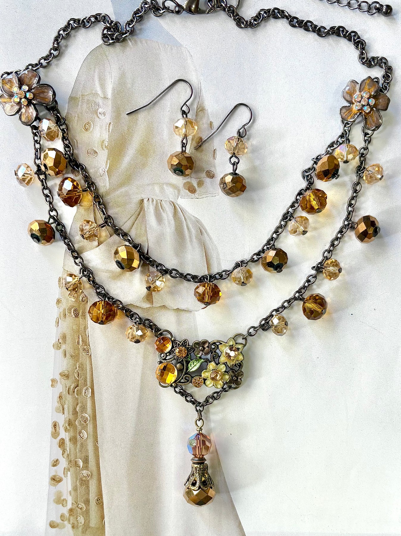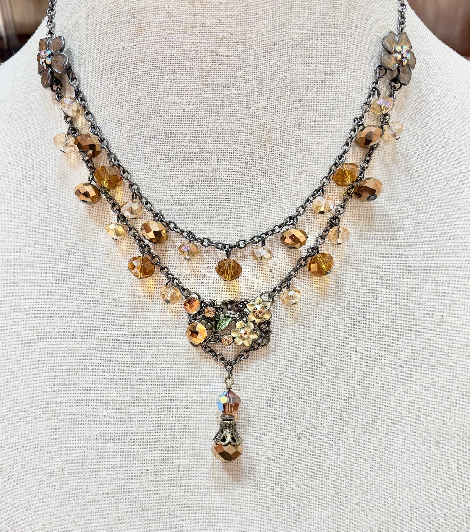 The Amber aurora crystals are so beautiful, but this vintage necklace needed more pizazz. I took a vintage floral bracelet linkage and inserted it as a feature piece, then added a dainty drop. This sweet piece now is a WOW! I’m including the simple coordinating crystal earrings. So much to love!