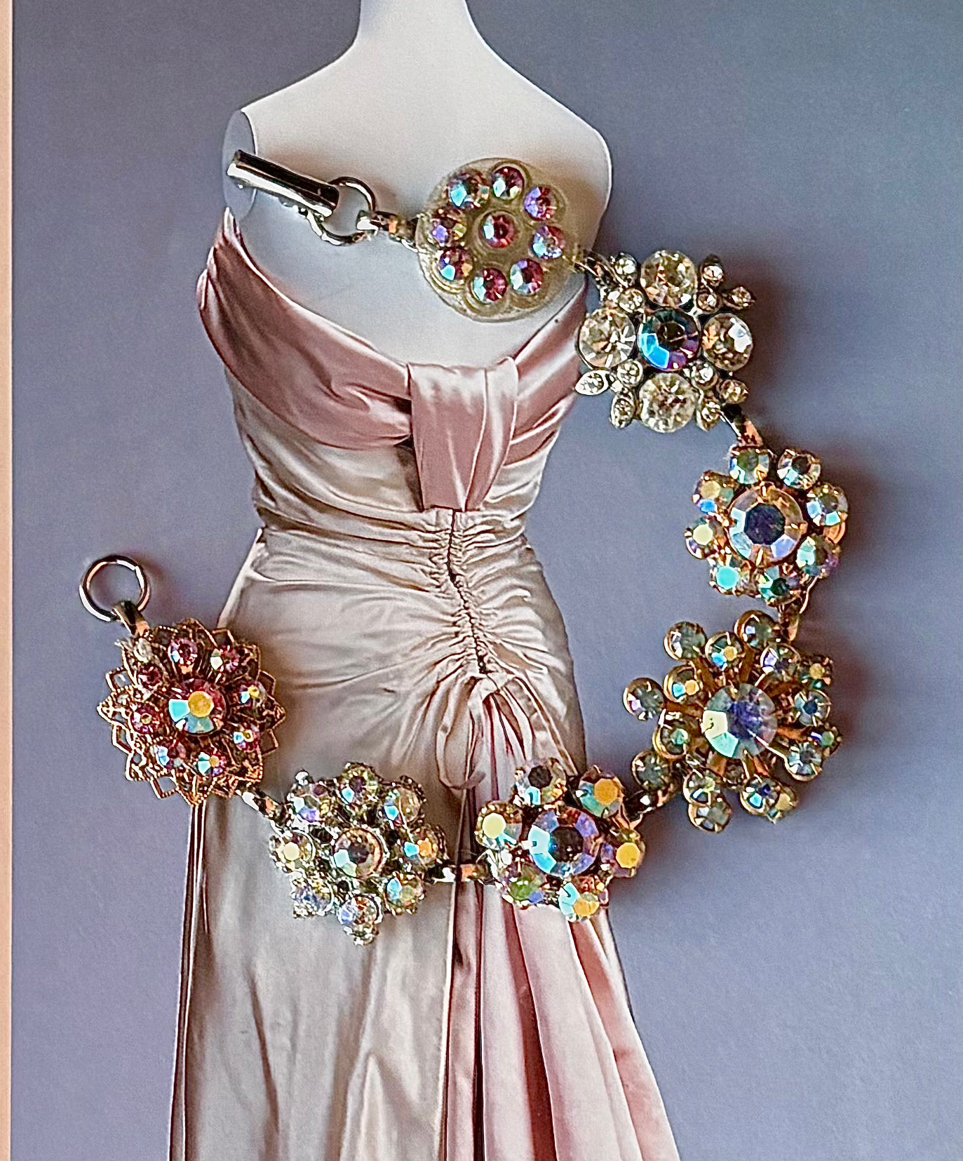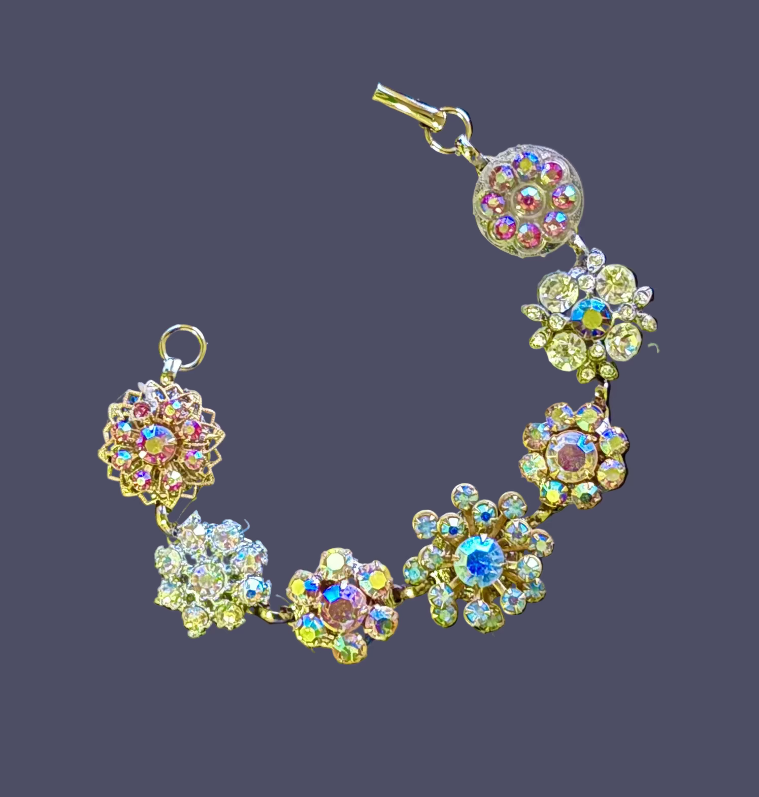 This beautiful crystal bracelet actually shines every color in the rainbow. (SO much prettier in person!) These aurora pieces are sourced from mid century clip on earrings or scatter pins. It is a perfect piece for a special occasion or just for when you want to wear that little something!